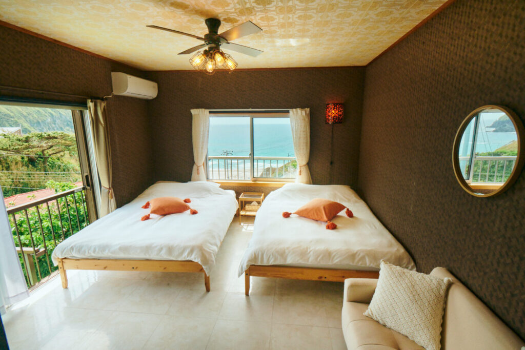 Guesthouse Teramachi is located in a quaint private house built back in the 80s in a unique style typical to the island. The owners then renovated and turned the building into a spacious guest house with a big, inviting shared space where you can meet and chat with other guests and visiting locals alike. It’s situated in the very center of Kozushima Village, only five minutes away from the beach! Teramachi offers three rooms that can accommodate up to three, four, and six guests, respectively. By default, they are used as co-ed dorms. However, depending on the number of guests at the time, the owners will do their best to accommodate your requests and let you use one of the rooms as a private room or convert it into a co-ed dorm for the period of your stay (note that renting out a whole room is a bit more expensive).